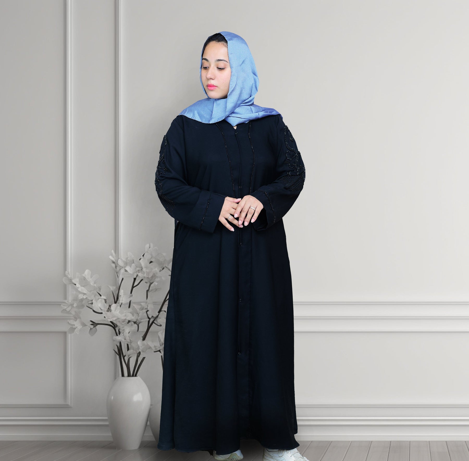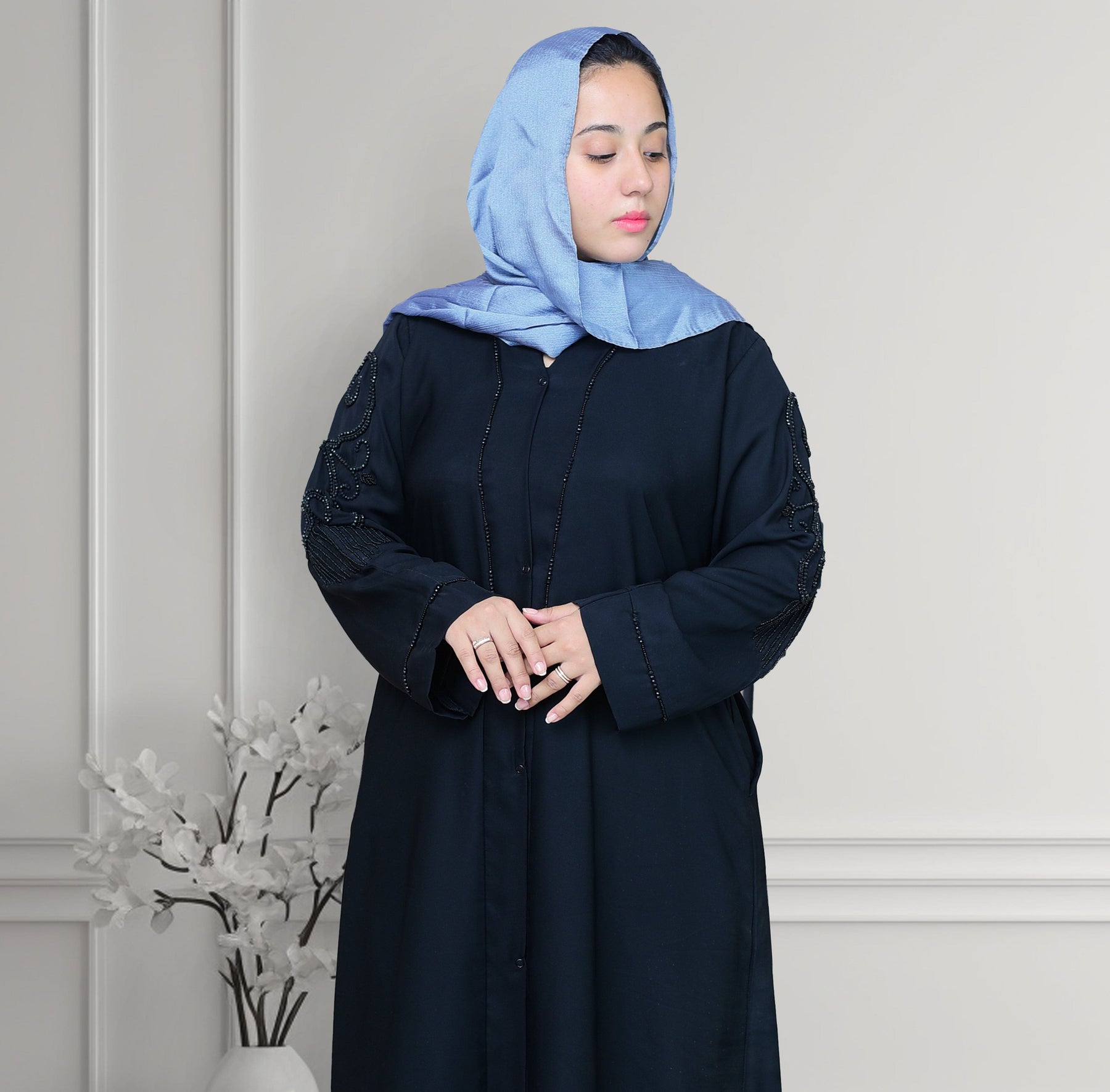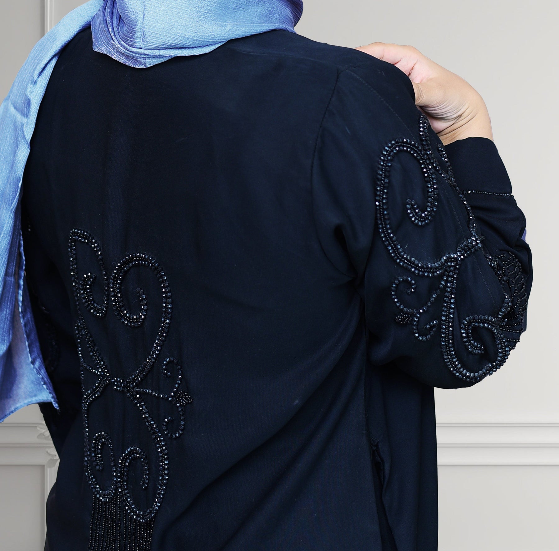 Elevate your modest wardrobe with this luxurious Nida fabric abaya. Featuring intricate cut dana work on the sleeves and back, this abaya exudes sophistication and grace. The soft and flowy Nida fabric ensures maximum comfort, while the two side pockets add functionality to your style. Perfect for both casual and formal occasions, this front-open abaya is a must-have for every fashion-forward woman..