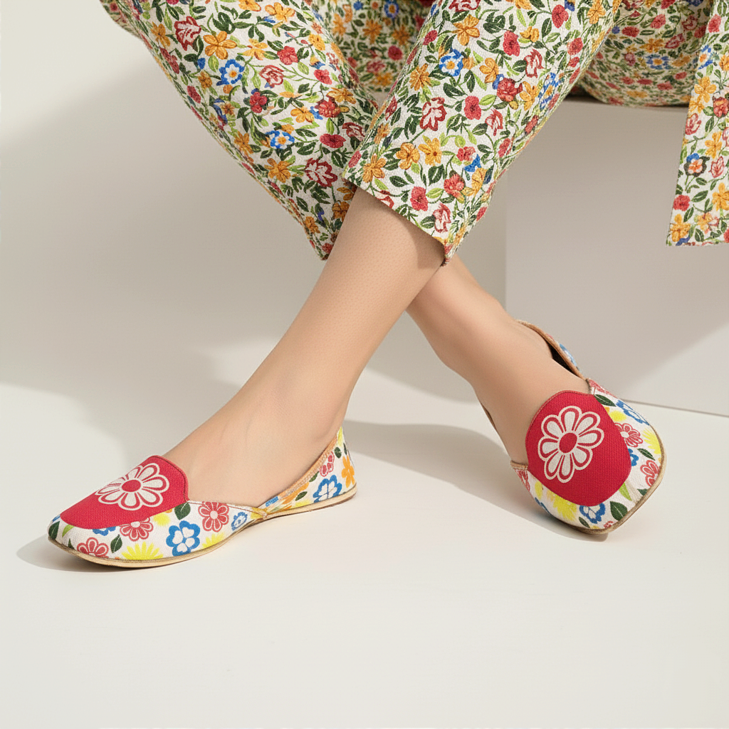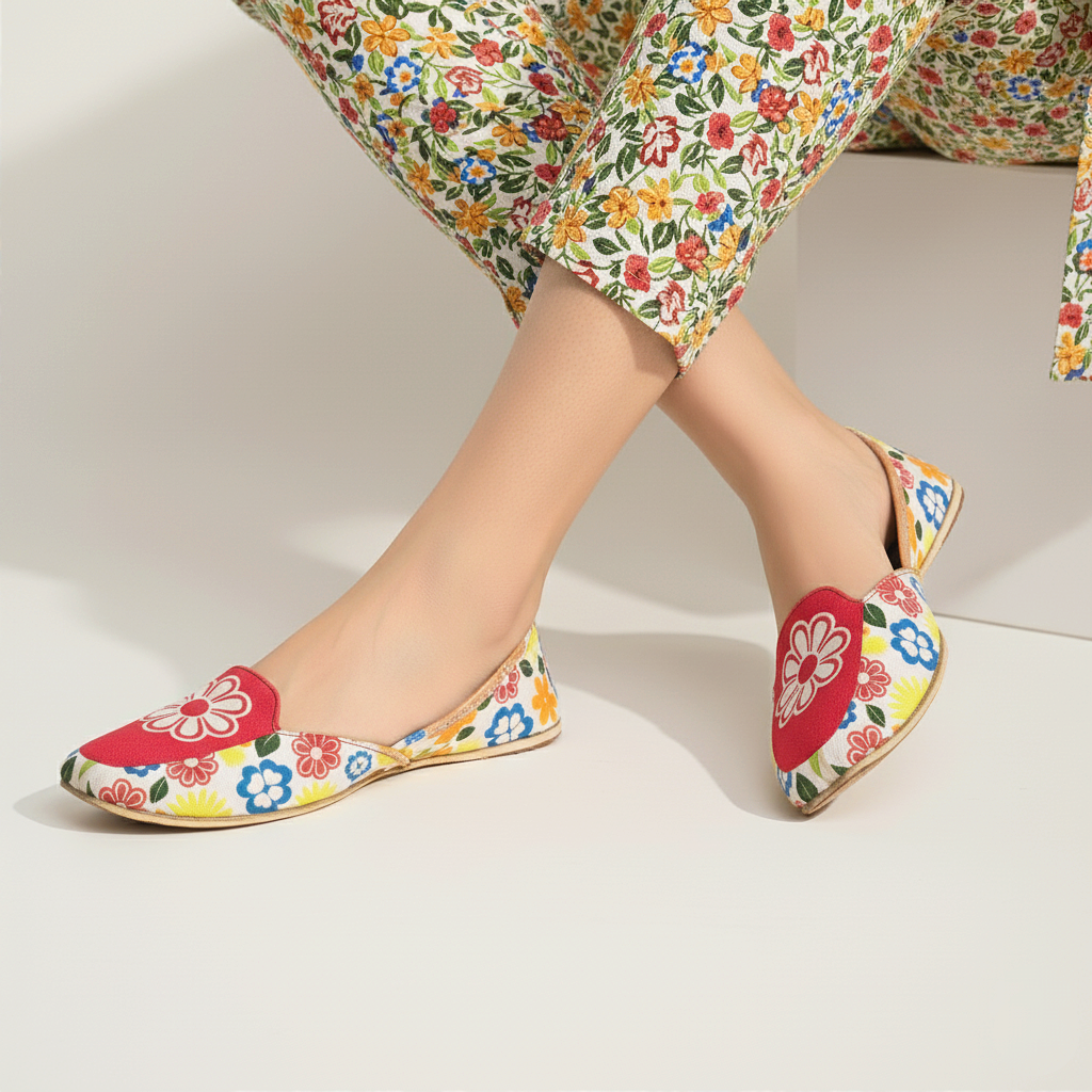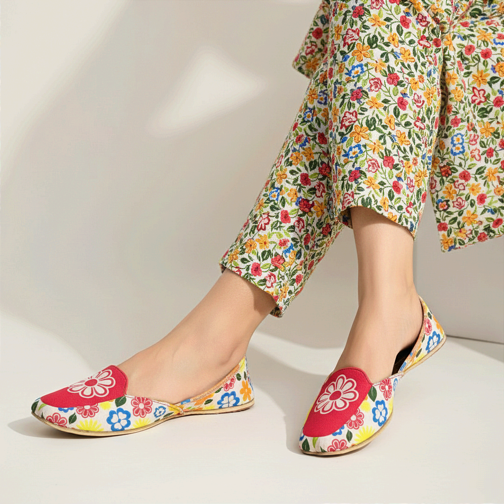Inspired by the dazzling colors of nature, the Peacock Loafers are your essential accessory for stylish comfort. These lively slip-ons showcase a rich, multi-floral print on a soft base. The design is punctuated by a bold, crimson-red toe featuring a simple white flower—a cheerful splash of color that guarantees attention. They're soft, supportive, and the perfect shoe to add a confident, carefree, and colorful touch to your look all season long.